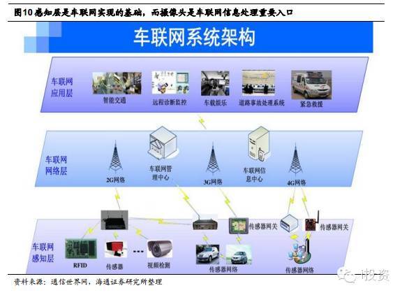 車聯(lián)網(wǎng)架構(gòu)自下而上依次是感知層、網(wǎng)絡(luò)層和應(yīng)用層,分別擔(dān)任信息采集、傳輸和處理功能。通過 GPS、RFID、傳感器、攝像頭圖像處理等裝臵,車輛可以完成自身環(huán)境和狀態(tài)信息的采集;并經(jīng)由網(wǎng)絡(luò)層將自身的各種信息傳輸匯聚到中央處理器;通過計算機技術(shù),這些大量車輛的信息可以被分析和處理,從而提供最佳路線、及時匯報路況和安排信號燈周期等多種服務(wù)。感知層是車聯(lián)網(wǎng)實現(xiàn)的基礎(chǔ),而正如人類 80%的信息都來自人眼,攝像頭是車聯(lián)網(wǎng)信息處理的重要入口。