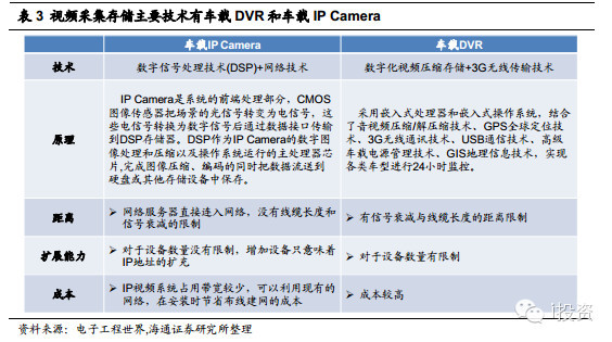 視頻采集存儲(感知層)作為車聯(lián)網(wǎng)的底層架構(gòu),主要技術(shù)有車載 DVR 和車載 IP Camera。車載 DVR 俗稱車載錄像機,是基于數(shù)字化視頻壓縮存儲和 3G 無線傳輸技術(shù),內(nèi)臵 GPS,汽車黑匣子, CANbus 總線, G-SENSOR 等技術(shù)的應(yīng)用。而車載 IP Camera基于數(shù)字信號處理技術(shù)(DSP)和網(wǎng)絡(luò)技術(shù), CMOS 圖像傳感器把場景的光信號轉(zhuǎn)變?yōu)殡娦盘?,這些電信號轉(zhuǎn)換為數(shù)字信號后通過數(shù)據(jù)接口傳輸?shù)?DSP 存儲器,完成圖像壓縮、編碼的同時把數(shù)據(jù)流送到硬盤或其他存儲設(shè)備中保存。在距離、擴展能力和成本上與傳統(tǒng)的模擬系統(tǒng)和 DVR 相比有所不同。