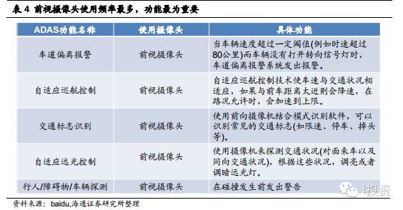 從 ADAS 角度來看,前視攝像頭使用頻率最多,功能最為重要,因此也是滲透率最高的攝像頭之一。前視攝像頭除了兼具行車記錄外,可實現(xiàn) ADAS 六大功能中的五項:車道偏離預(yù)警、車輛、行人與障礙物預(yù)警、交通標(biāo)志識別、自適應(yīng)遠光控制。同時由于車載攝像頭傳輸信息量過大且要求芯片進行快速整合、運算、處理。因此市場初期的ADAS 系統(tǒng)往往以前視攝像頭為主。
