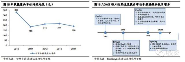 ADAS 初期以前視攝像頭為主,但隨著 ADAS 時代的普及尤其是全自動駕駛時代的來臨,車載攝像頭數(shù)目將迅速提升到平均單車 7 顆。而攝像頭數(shù)目的提升和芯片運算速度的提升以及傳感器單價的降低密切相關(guān)。以國際 ADAS 領(lǐng)導(dǎo)者 Mobieye 的產(chǎn)品路徑為例,其 2010 年推出的 EyeQ2 芯片運算速度是 2007 年首款產(chǎn)品 EyeQ1 的 6 倍,而 EyeQ1與 EyeQ2 配套搭載單顆攝像頭,只有當(dāng)運算速度實現(xiàn)了突飛猛進的增長后 Mobileye 才計劃于 EyeQ3 搭載 3 顆攝像頭,其運算速度是其前代產(chǎn)品的 8 倍。
