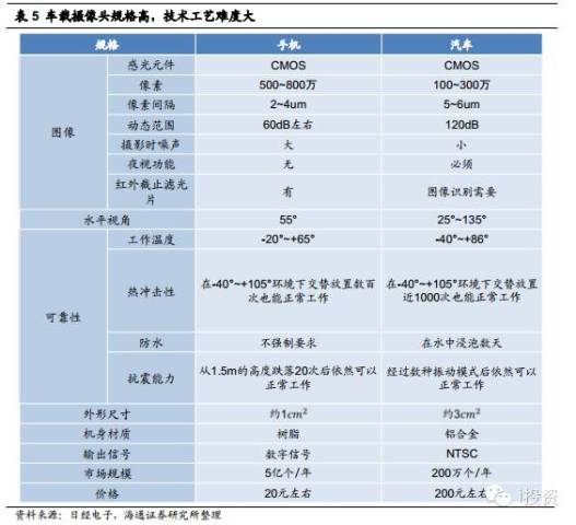 相較手機攝像頭,車載攝像頭技術(shù)工藝難度更大,主要是其對可靠性的高要求所致。不同于一般的攝像頭,汽車攝像頭連續(xù)工作時間較長、所處環(huán)境往往震動較大且一旦失效將會對用戶生命安全造成致命威脅,因此對于模組和封裝等要求嚴(yán)格。汽車攝像頭測試需要在水中浸泡數(shù)天,以及 1000 小時以上的溫度測試,還包括從零下 40 度到零上80 度的迅速跳轉(zhuǎn)。并且汽車攝像頭需要具備夜視功能以保證夜間可以正常使用。