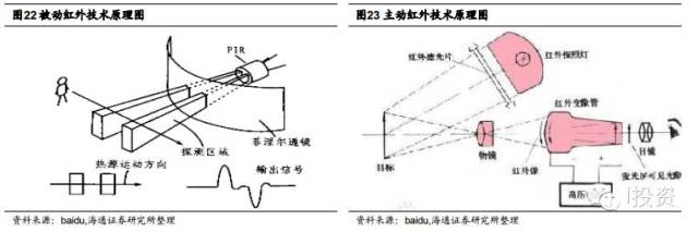 已投入應(yīng)用的夜視技術(shù)有三大類:微光夜視技術(shù)、被動紅外夜視技術(shù)、主動紅外夜視技術(shù)。微光利用夜間目標(biāo)反射的低亮度自然光,將其增強放大到幾十萬倍,從而達到適于肉眼夜間進行觀察的圖像。被動紅外夜視技術(shù)是通過接收探測熱源與背景紅外線輻射差進行成像,相比于微光以及主動紅外技術(shù)不需要額外光源,且探測距離最遠,準(zhǔn)確性高但成像也最為模糊,畫面辨識度低。主動紅外技術(shù)又稱為近紅外夜視技術(shù),通過紅外探照燈發(fā)射不可見光照射目標(biāo),并利用反射的光線成像,可視距離適中,成像清晰。