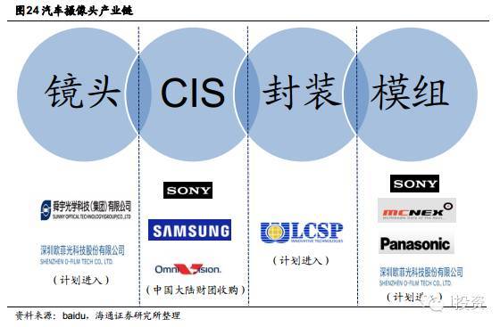 車載攝像頭產(chǎn)業(yè)鏈主要由鏡頭、模組、封裝和CMOS 芯片 4 部分構(gòu)成。其中模組的技術(shù)門檻最高、工藝最復(fù)雜。前裝攝像頭模組市場被日系松下、索尼以及韓系 MCNEX廠商瓜分。國內(nèi)進入車載攝像頭領(lǐng)域廠商一般都是先從手機攝像頭做起,具有技術(shù)積累后向汽車攝像頭轉(zhuǎn)移,比如原先做手機攝像頭鏡頭的舜宇光學(xué)和手機攝像頭封裝的晶方科技。