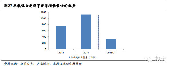 值得一提的是國內(nèi)一些傳統(tǒng)攝像頭廠商也在陸續(xù)進入車載攝像頭市場,比如從事手機攝像頭封裝的晶方科技以及手機鏡頭的舜宇光學(xué)。根據(jù)與產(chǎn)業(yè)界人士溝通,舜宇 2014年車載攝像頭 1124 萬顆,2015 年第一季度的出貨量達到 332 萬顆,第一季度同比增長29.7%。是舜宇光學(xué)毛利最多,增長最快的部門之一。