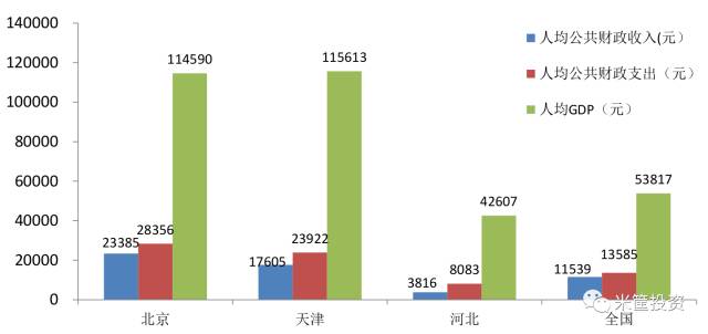 從GDP、人均GDP、人均收入等指標(biāo)看,京津冀中北京、天津、河北三個(gè)地區(qū)差異較大,河北大部分城市的人均收入、財(cái)政收入都在三大城市群中排名靠后,且遠(yuǎn)低于京津冀平均水平,成為明顯的洼地。而長(zhǎng)三角各省城市雖有差異,但落差較小,屬于較均衡的地區(qū)。
