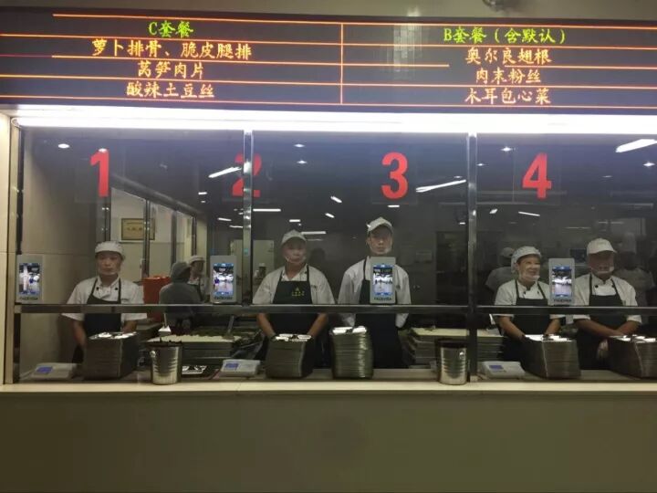 進了食堂,5個打菜窗口屏幕上各自對應著“A、B、C、D、E”五個套餐,學生根據(jù)自己選定的套餐到相應窗口排隊。