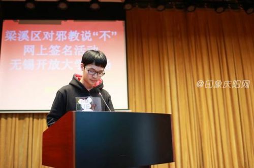 活動(dòng)中,學(xué)生代表莊嚴(yán)宣讀《對(duì)邪教說(shuō)不倡議書(shū)》,300名師生通過(guò)關(guān)注“無(wú)錫反邪教”微信公眾號(hào),參與網(wǎng)上簽名,對(duì)邪教說(shuō)“不”。