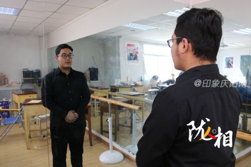 教室后面的大鏡子是張洋經(jīng)常待的地方之一。課余時間,張洋便會對著鏡子一遍遍練習(xí),檢查自己在誦讀稿件時有哪些表情或是動作還不到位。