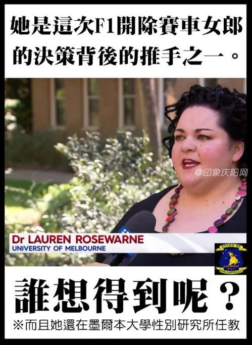 在F1的聲明發(fā)布后的一周內(nèi),墨爾本大學(xué)講師羅斯沃恩(Lauren Rosewarne)接連接受來自當(dāng)?shù)匦侣?臺、9臺、墨爾本電臺等媒體的采訪。其中,在面對新聞9臺記者的提問時(shí),羅斯沃恩這么評論