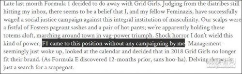 在博客中,她明確寫道,自己和F1賽事主辦方“取消賽車女郎”一事毫無關(guān)系,這僅僅是大獎賽官方一種“自我覺醒”。“作為長期致力于為女性維權(quán)的學(xué)者,我甚至沒有覺得這是女權(quán)斗士們的勝利,而是一個(gè)時(shí)代必然的產(chǎn)物。”