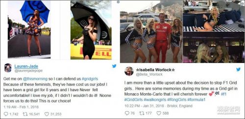 從事賽車女郎一職已有8年的職業(yè)人士杰德(Lauren Jade),聽聞此事在推特上大罵:“都怪這些女權(quán)人士,害得我們連飯碗都沒有了!8年來,我從來沒有因?yàn)槭且粋€(gè)賽車女郎而感到不高興過,我愛我的工作!這是我們的選擇!”