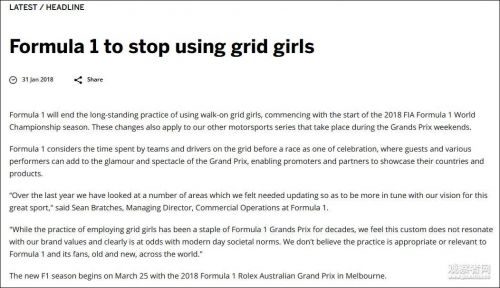 今年的F1賽季將從3月份開始。言下之意,在首站澳大利亞墨爾本阿爾伯特公園賽道內(nèi),無論是發(fā)車前的F1賽車旁邊,還是領(lǐng)獎臺上前三名車手的身邊,將不再有賽車女郎的身影。