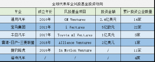 第二階段則是車企通過風(fēng)投基金運作,投資新興科技公司并希望將最新技術(shù)得以運用來達到自身發(fā)展。類似車企有雷諾-日產(chǎn)-三菱聯(lián)盟成立“Alliance Ventures”投資基金,通用和寶馬汽車在2010年左右就先后投入資金成立了企業(yè)的專項投資基金,涉足AI、無人駕駛、共享出行和能源材料等初創(chuàng)行業(yè)。