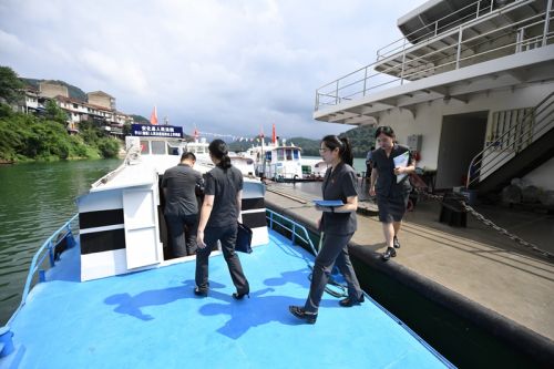2023年7月19日,湖南省益陽市安化縣人民法院干警在柘溪客運碼頭登上“水上法庭”。“水上法庭”可以開到離當事人更近的港口、岸邊,為群眾減輕訴累。新華社記者 薛宇舸 攝