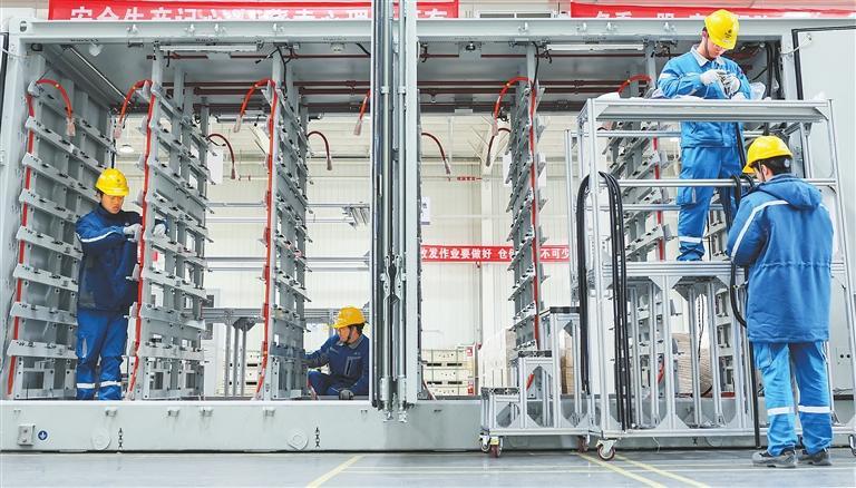 在遠景酒泉智慧儲能系統(tǒng)制造基地生產車間,工人正在加緊生產。