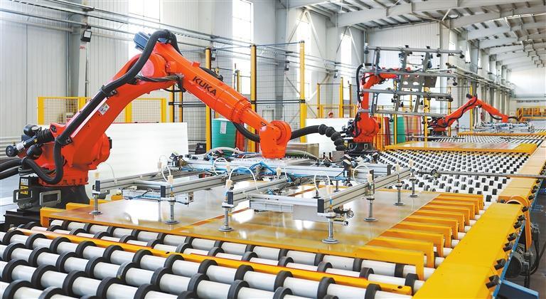 甘肅凱盛大明光能科技有限公司生產線上,智能機械臂正在進行生產。