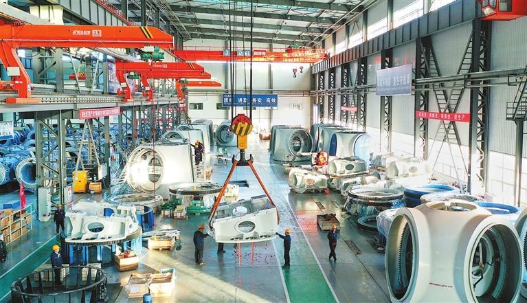 東方電氣(酒泉)風電設備有限公司大型風電機組總裝生產車間一派忙碌景象。