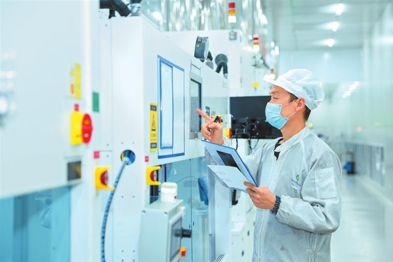工作人員在酒泉正泰新能源科技有限公司高效晶硅電池生產無塵車間查看生產情況。