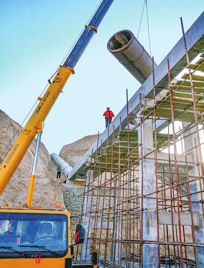 揚(yáng)黃甘肅專用工程建設(shè)中,起重機(jī)在架設(shè)管道。