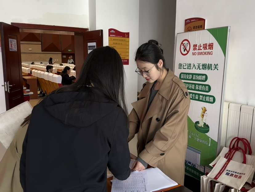 在報到處,“青春為中國式現(xiàn)代化挺膺擔(dān)當(dāng)”的字樣映入眼簾,代表們精神飽滿,工作人員正井然有序地為報到代表分發(fā)證件和會議資料,提醒會期相關(guān)注意事項(xiàng)。